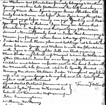 Item – it is my will and I do order that in the first place all my (?) Debts and funeral charges be paid and satisfied idem. I give I given and bequeath unto Margaret my beloved wife the black (Pea?ing) mare and bolt and arid Cow called (?teatly) and her Calf Itim I give to my beloeved sons George and frances this Plantation I now live on to be Equaly divided between I likewais give to George a yellow Cow Called long legs and a Sorrel Mare and her bolt Itim I give and bequeath to my son Malcom that plantation formerly belonging to Mathew Young and a col cald Patterson and her Calf and a bay pasing Mare Itim I give to my son James a Red Coiw cald lovely and to Frances (arid hefan?) Itim I give to my Daughter Margret a pyd hefar nancy one pyd Yearling and Red Yearling heafer to (retain?) I give to my son James that plantation in the forks and that part of my plantation Samuel Norwood formly lived on I order that James pay to Macom five pound when come to the age of Menuraty I order the to work (?homes) plow and tacklings not to be sold but them between George and Malcom to work the plantation with I give to my Daughter Isble on black pasing Mare I order my beloved wife Margret to have her Mantanance of this plantation I now live on as long as she remains widow and to have no (fander?) part in the land I order all the moveable to be praised and to be Equally Devided among the seven children I order Margaret my beloved wife and my son George to be my (sole?) and (vote?)) Executor Of this my last will and testament