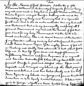 In the name of God Amen October the 9 1761. I Frances McCown in the County of Augusta farmer being very sick and weak in body but in perfect Mind and Memory thanks be given unto god and therefore calling unto mind the Mortaliity of my Body and knowing that it is appointed for all men once to die do make and Order this my last will and Testament that is to say principally and first of all I given and Recommend my soul into the hands of god that gave it and for may body I Recommend it to the Earth to be buried in a Cristian like and decent manor at the discretion of my Executor nothing doubting but at the General Rejunevation I shall Receive the same Again by the mighty power of god and as Touching such Wordly Estate wherewith it hath pleased god to help me in this life I give Devise and dispose of the same in the following Manner and form